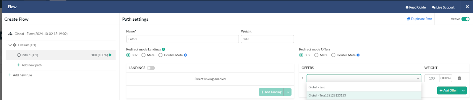 In the newly opened window click “Add new path”. Then select the type of redirect and add landing pages, or disable the function if you don’t have them. You can enter the exact same info as in the picture. After that, add the offers you’ve connected by clicking the “Add offer” button and choosing the needed ones or creating a new one.