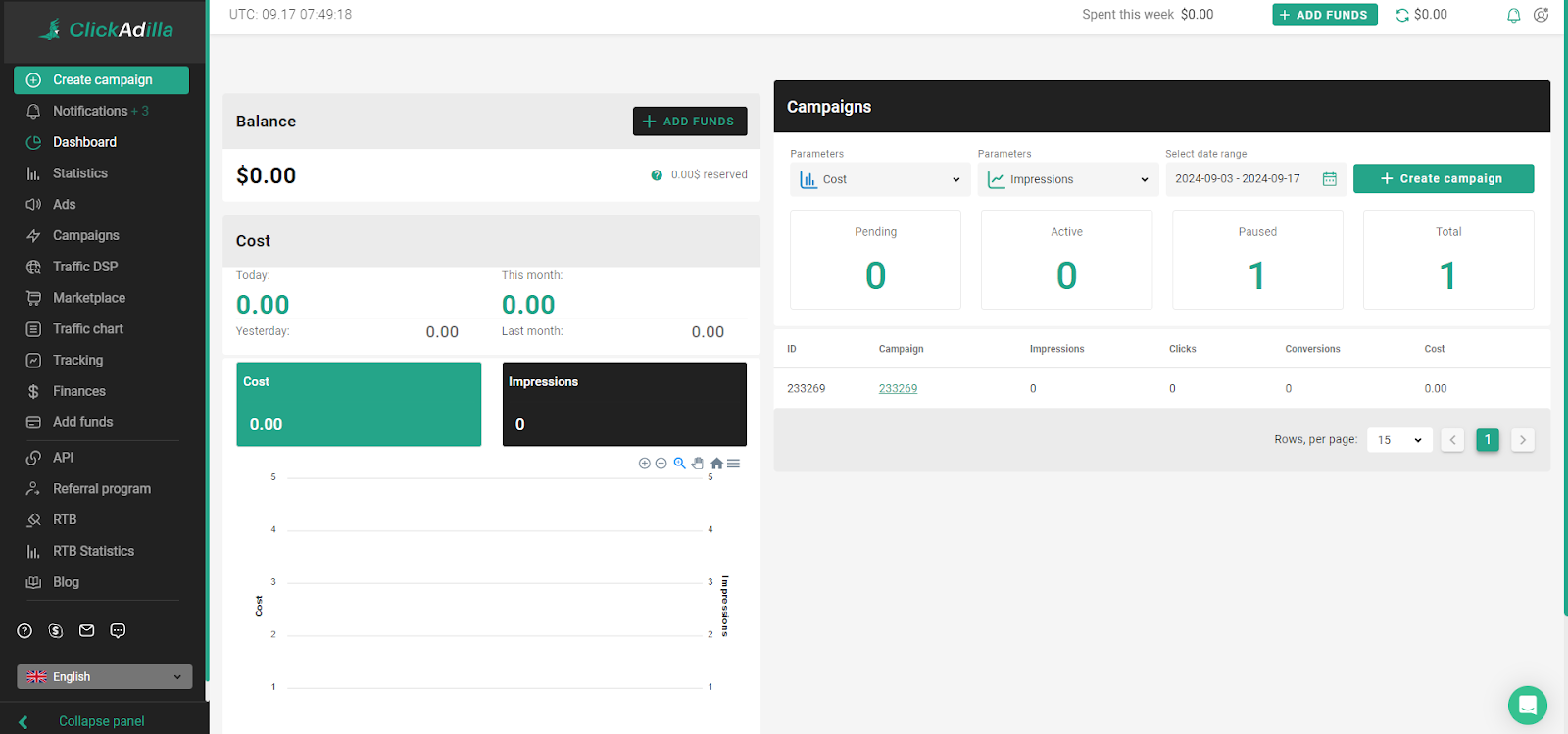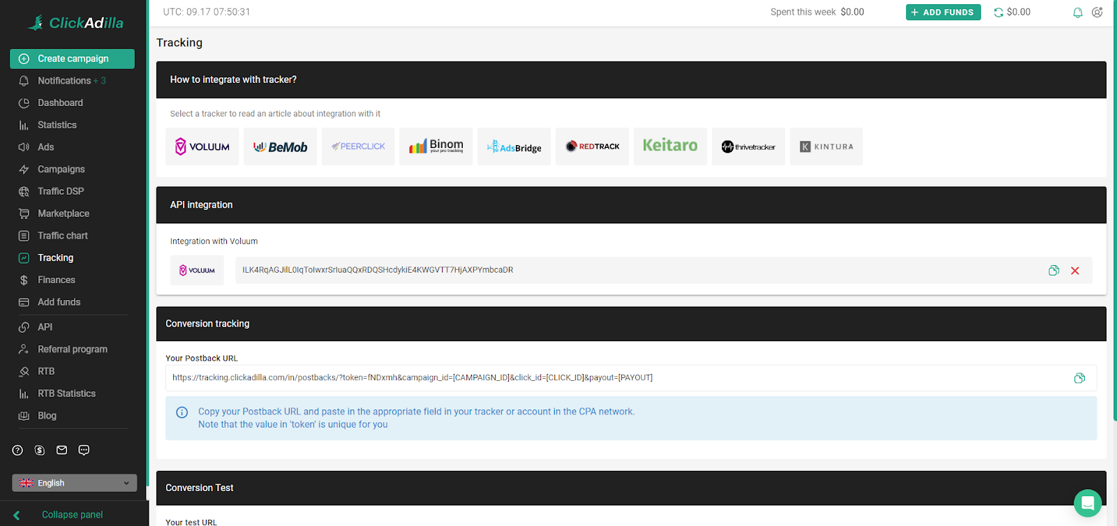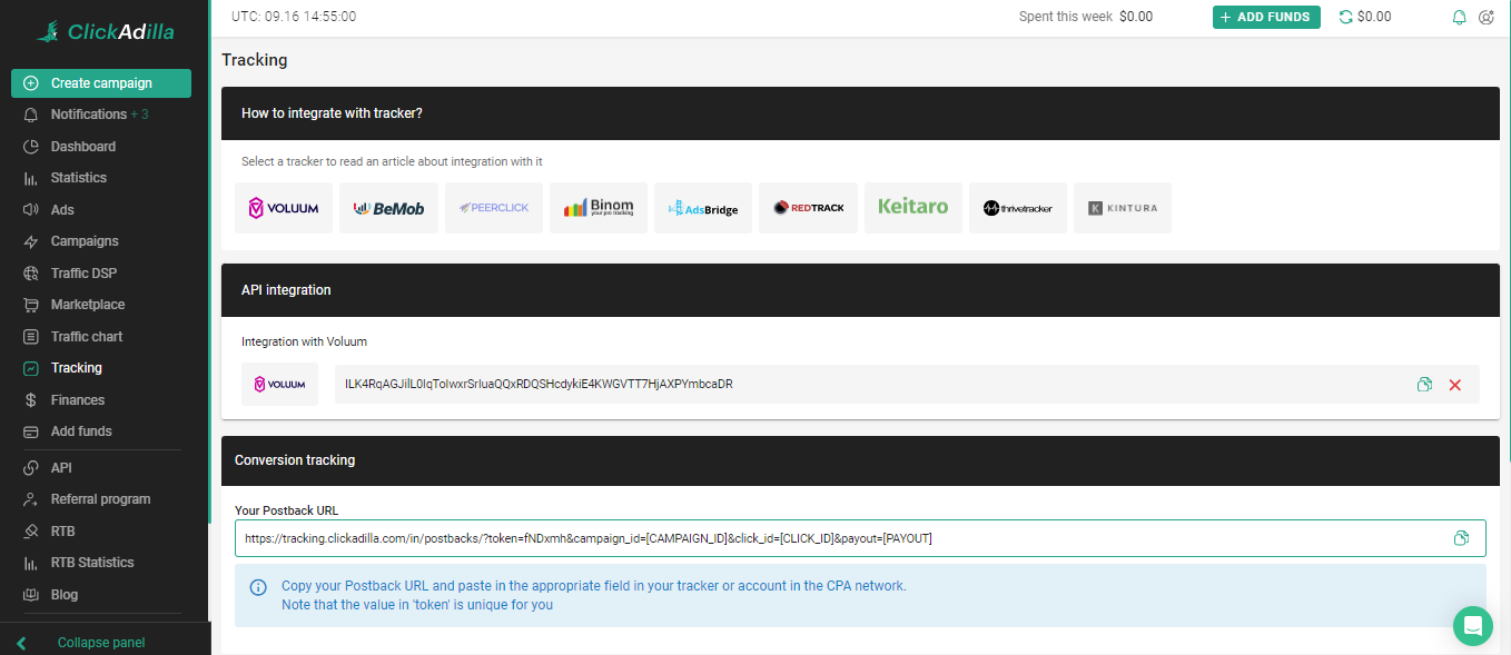 Log in to your ClickAdilla Advertiser Account and click the Tracking tab.