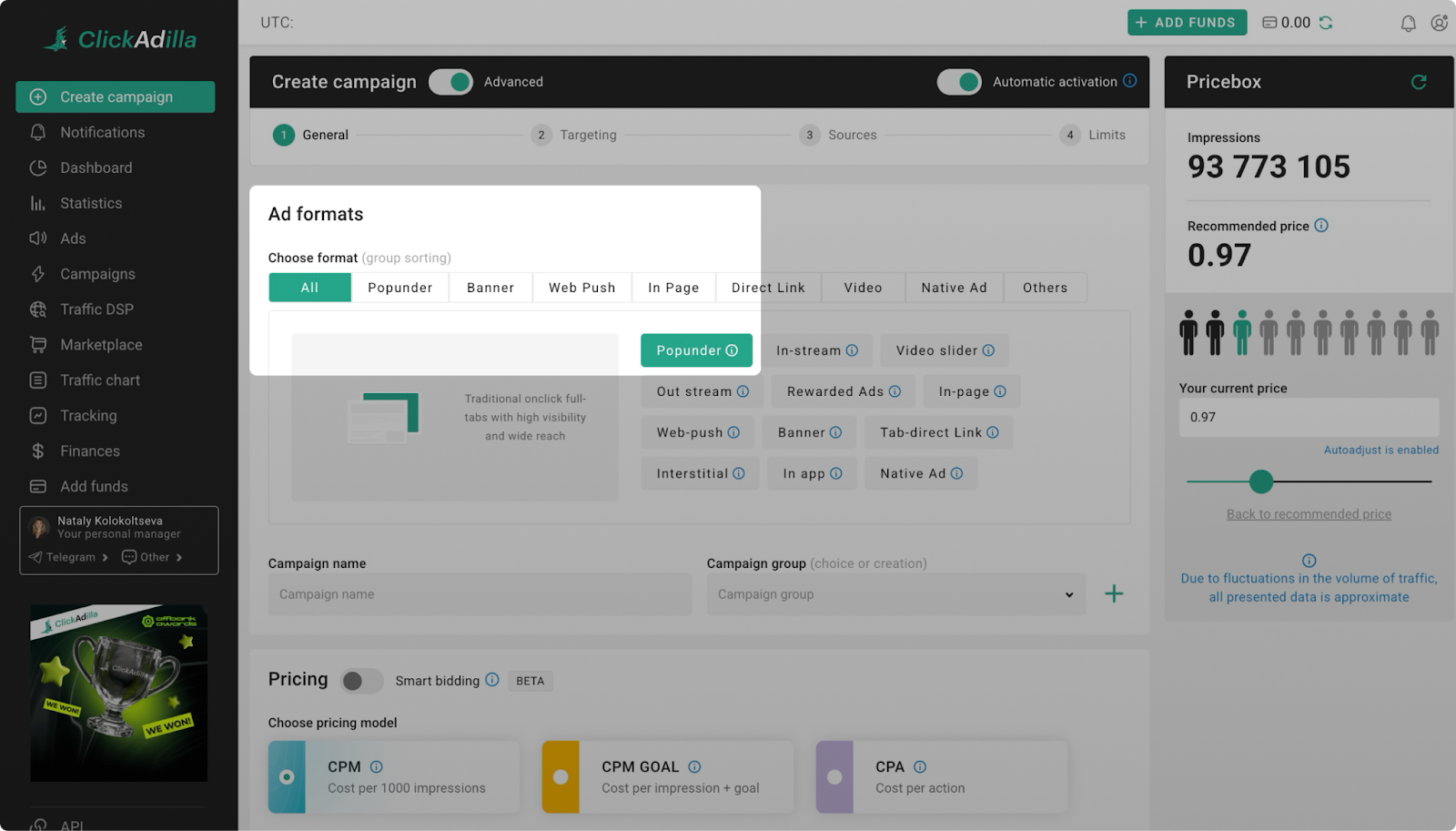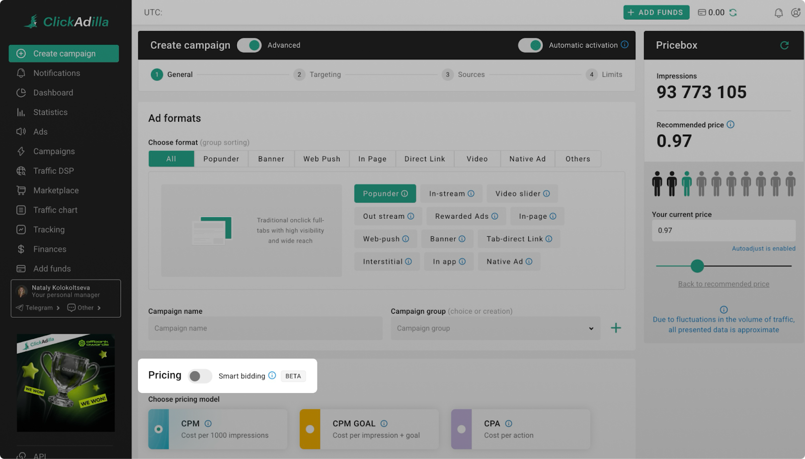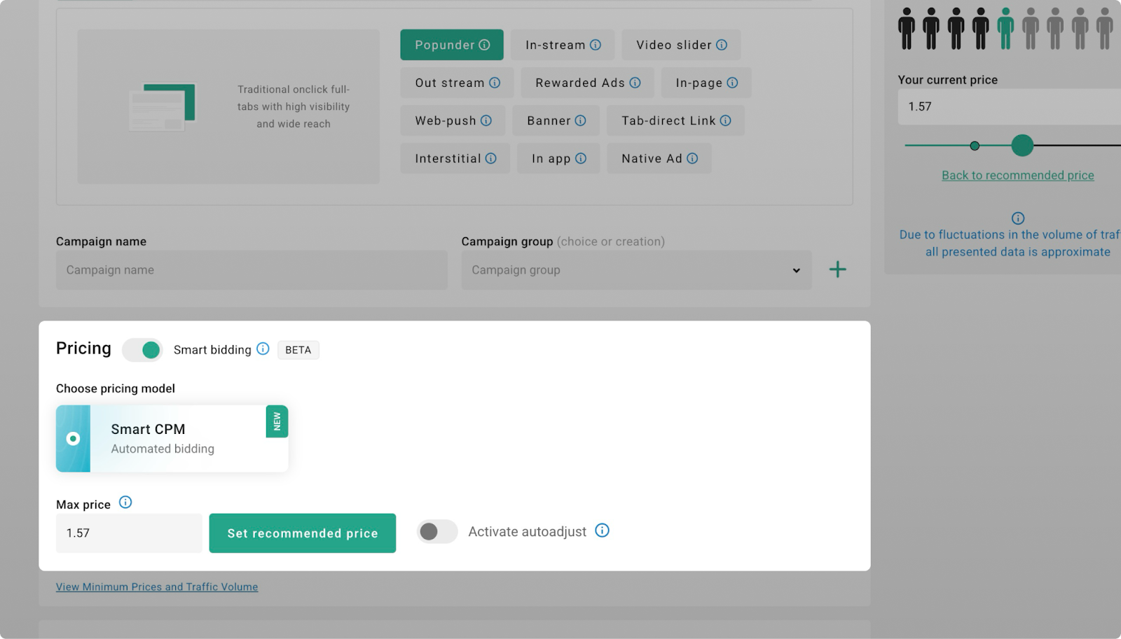 To enable Smart CPM, simply toggle on Smart bidding. You can conveniently set a max price above the suggested one. After your campaign starts, bids adjust automatically, ensuring you purchase traffic at the most competitive prices.