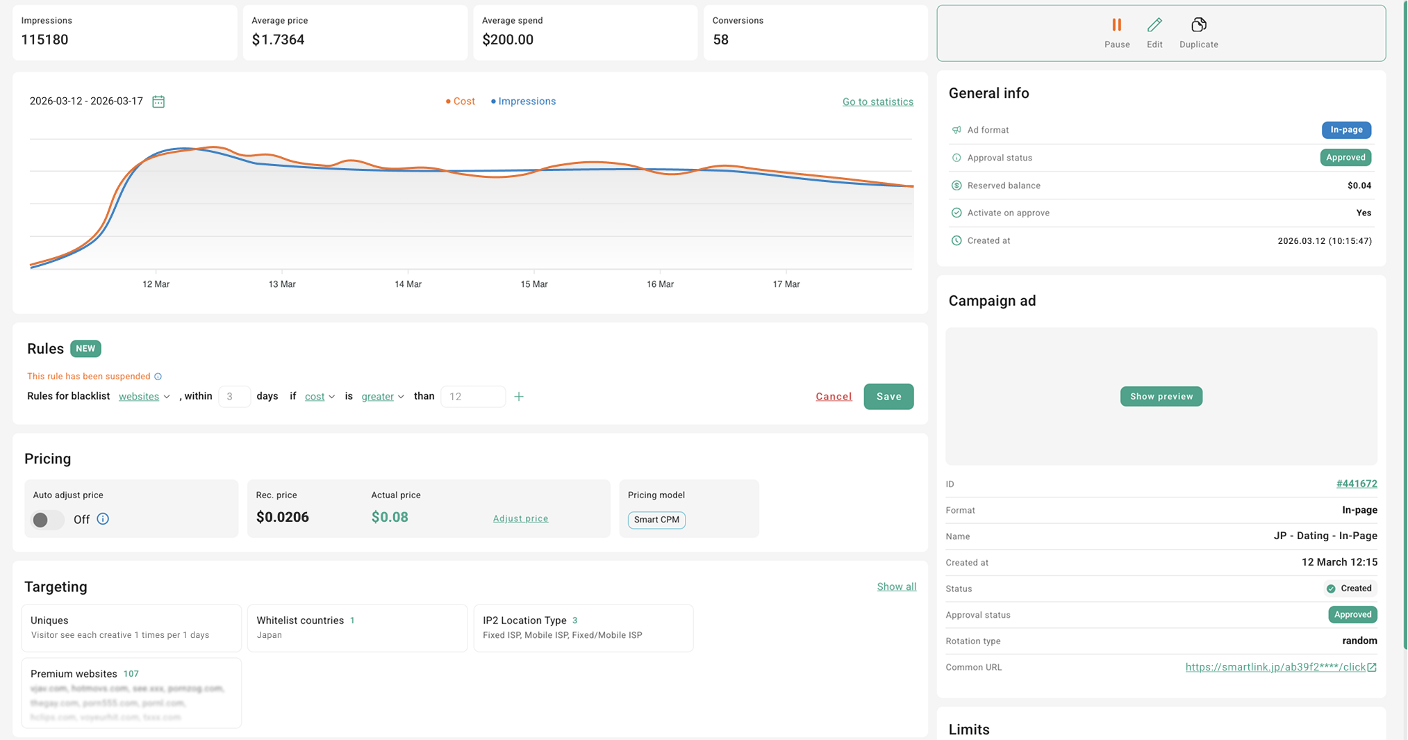 Окей, вызов принят. Я взял $200 из собственной зарплаты, создал абсолютно новый аккаунт в Clickadilla - как любой пользователь с улицы, с нулевой историей и без админских привилегий - и запустил Japan Dating на формате In-Page.