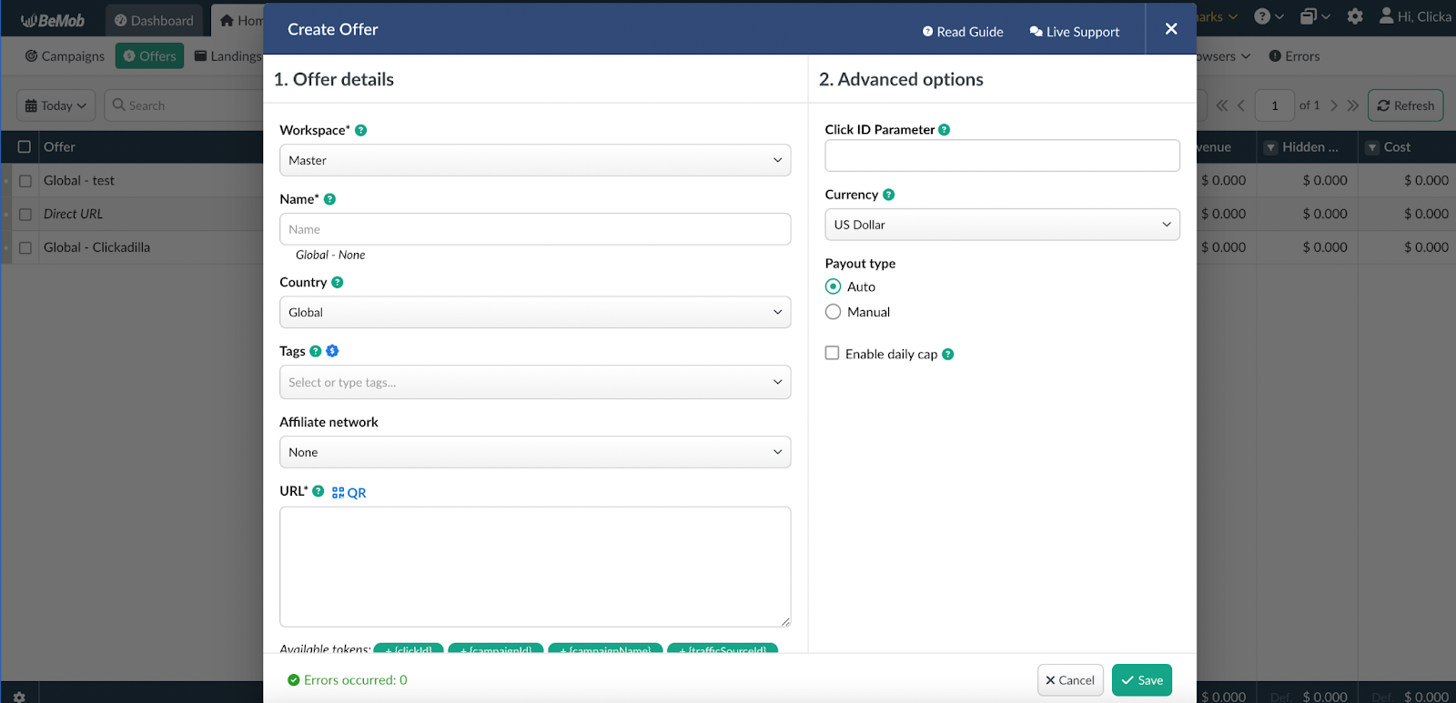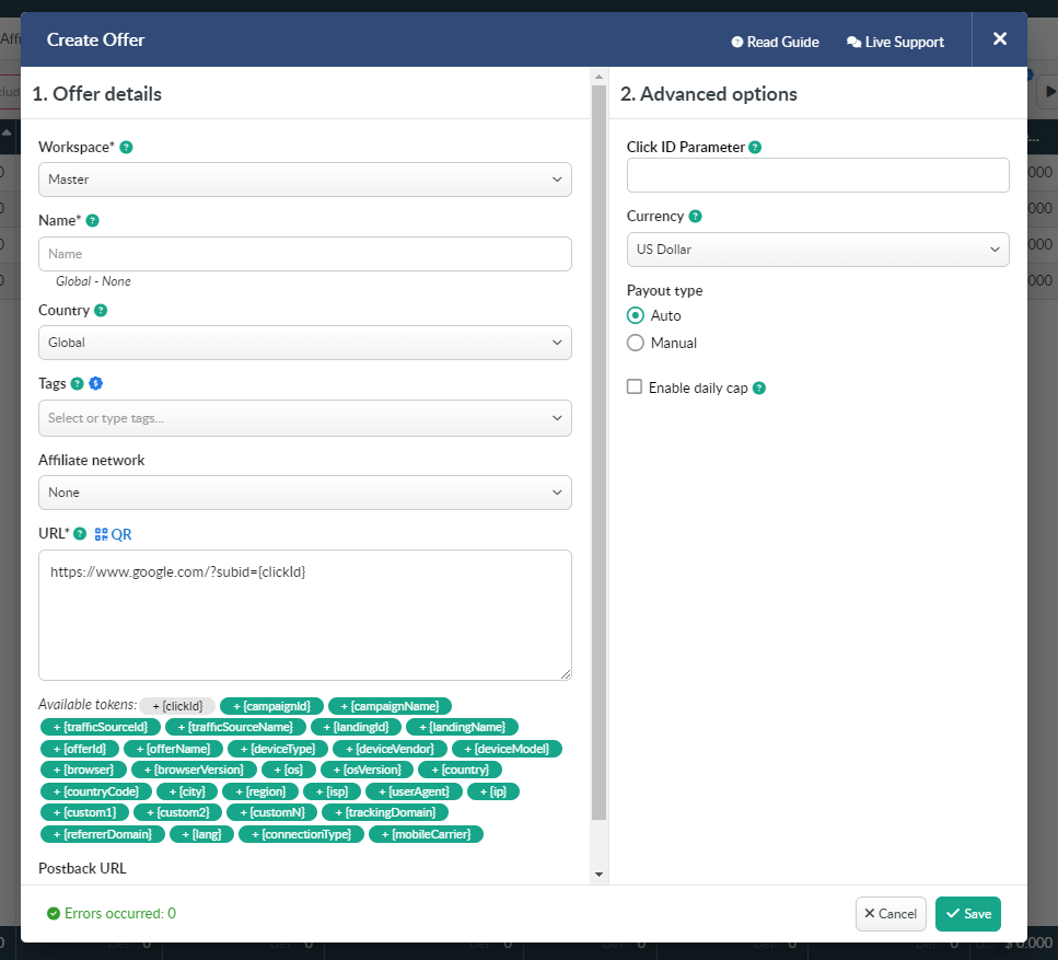 1. Создать оффер, в котором нужно указать id партнёрской сети =click id трекера (на скрине это subid={clickId}