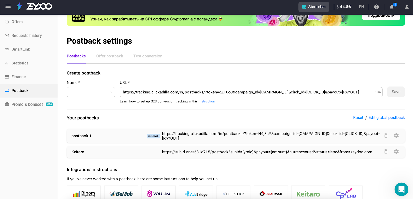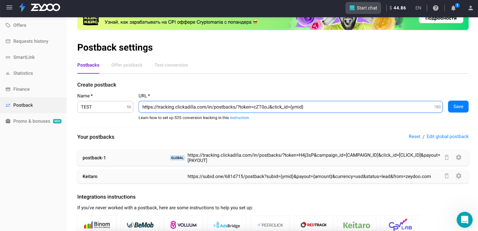 2. Зайдите в свой аккаунт ClickAdila и скопируйте URL-адрес для постбэка, затем вставьте его в свой аккаунт ZeyDoo в поле, отвечающее за постбэк. Помните, что параметры «ymid» и «var» должны быть приравнены к соответствующим “макросам” на стороне трекера (или рекламной сети).
