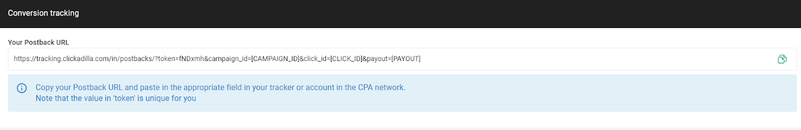 Ваш URL-адрес постбэка в Clickadilla будет создан автоматически.